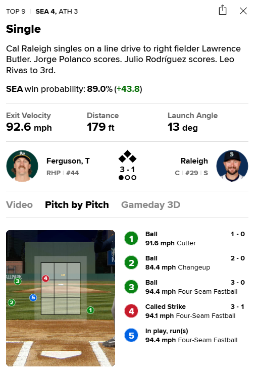 He stayed within himself and didn’t chase. He put the red light on a 3-0 when the pitcher was super wild and a walk would tie and prolong the game in the 9th. And then he smacked a pitch on the corner, not trying to hit his 13th home run, but just trying to put the ball in play. It found grass, Jorge and Julio scored, and the Mariners had a comeback win brewing.