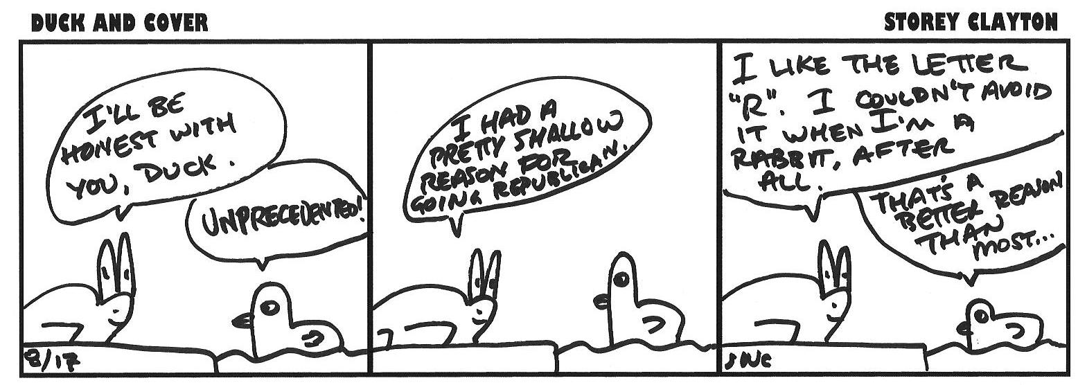 Duck and Cover is the new webcomic from Storey Clayton. Clayton is the author of Loosely Based, as well as four famous online quizzes. These include the Country Quiz, the Book Quiz, the State Quiz,