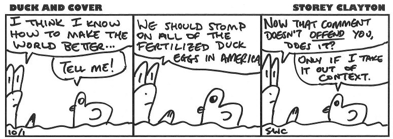 Duck and Cover is the new webcomic from Storey Clayton. Clayton is the author of Loosely Based, as well as four famous online quizzes. These include the Country Quiz, the Book Quiz, the State Quiz,