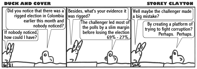 Duck and Cover is the webcomic from Storey Clayton.  Clayton is the author of Loosely Based, as well as many famous online quizzes.  These include the Country Quiz, the Book Quiz, the State Quiz, the Animal Quiz, & the Trains and Railroads Quiz, and University Quiz. His latest projects include the upcoming Book Quiz II and Song Quiz.