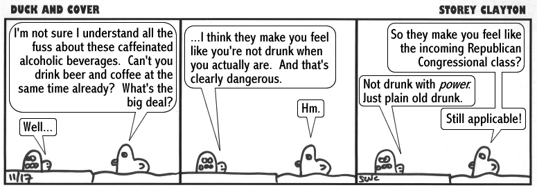 Duck and Cover is © copyright 2005-10 Storey Clayton.  Please feel free to post these comics around the web.  Links back to this site appreciated.